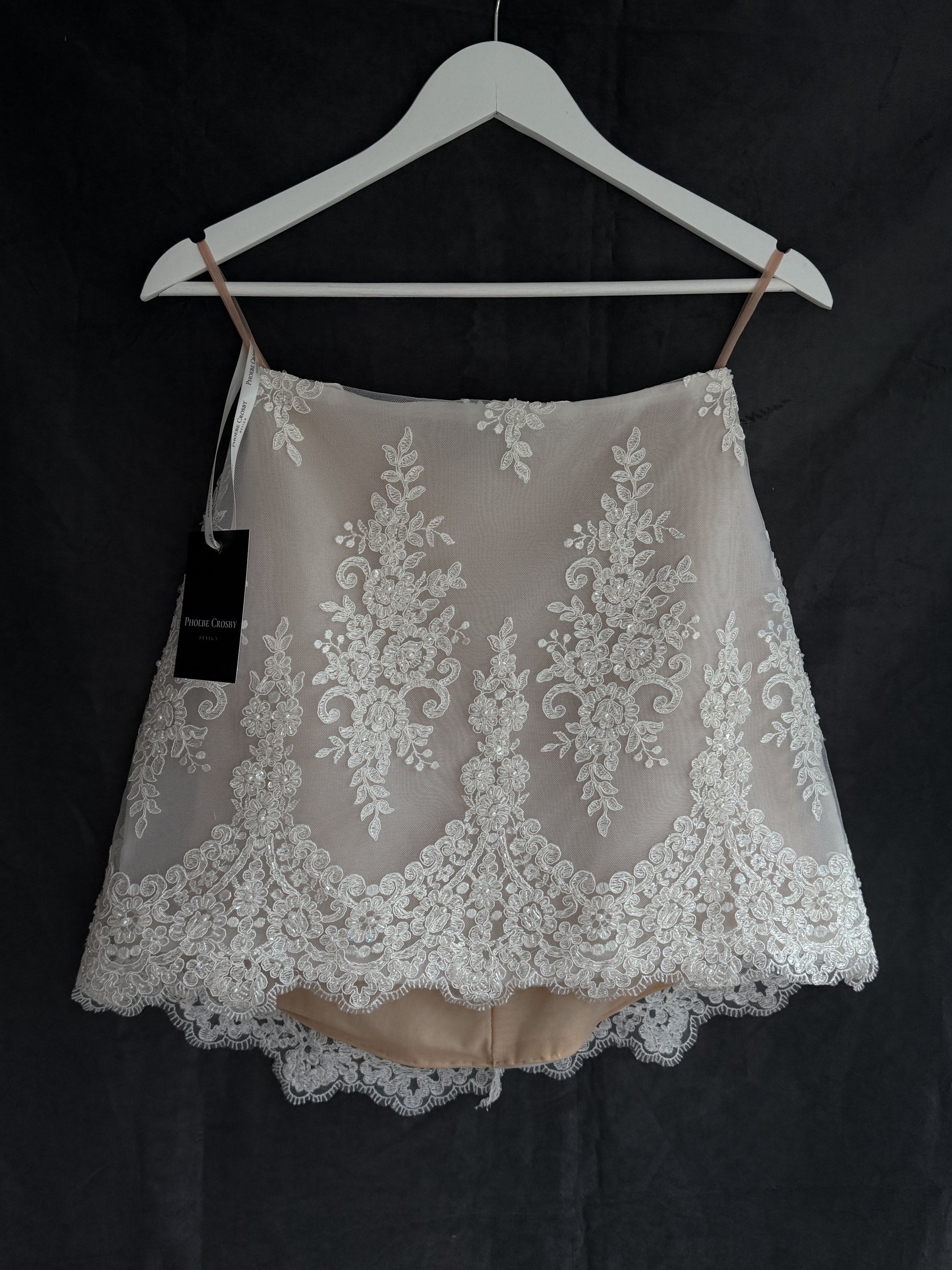 CELESTE is made-to-measure for each bride- a modern bridal statement, handcrafted with layers of nude mesh for that ethereal sheer effect, lightweight organza, and a stunning beaded lace.